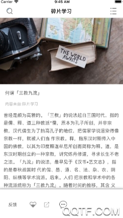 碎片学习App是一款非常方便的阅读软件,大家空闲的时候可以利用这款软件提升自己,这里有很多冷门小知识以及热门问题,不论是国内的还是国外的文人事迹还是生活中的经验技巧这里都有,通过这款软件我们会发现很多我们从未听说过的知识,快来下载吧!